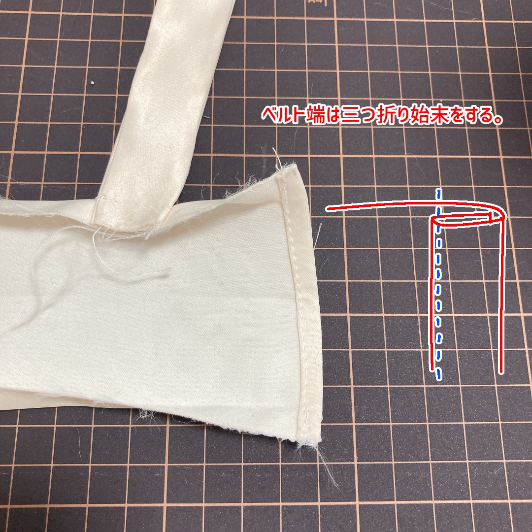 ④③で作成したテープを①のベルトに縫い合わせていきます。
