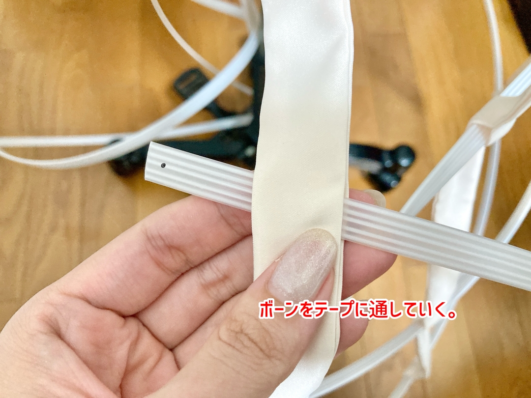 テープに通せたら、先ほどあけた穴に糸を通してボーンをテープに固定していきます。