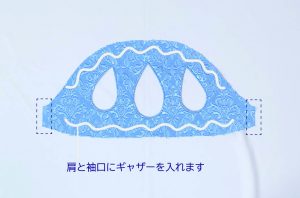 ④袖にギャザーを入れ、点線で囲まれた部分同士を縫い合わせ、円柱型にします。