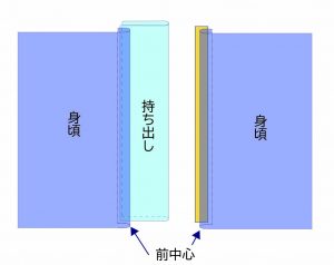 ⑧前身頃の片側にパイピングを、片側に持ち出しを縫い付けます。