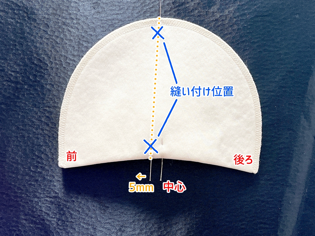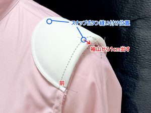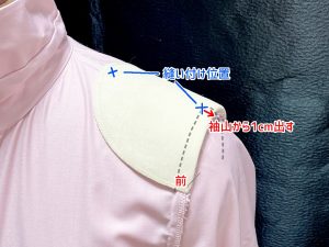 肩パットは袖山から5㎜~10㎜袖側に出した状態で縫い合わせます。