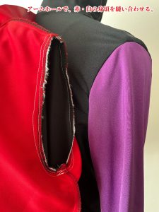 画像は赤・白を縫い合わせて袖をつけた状態。