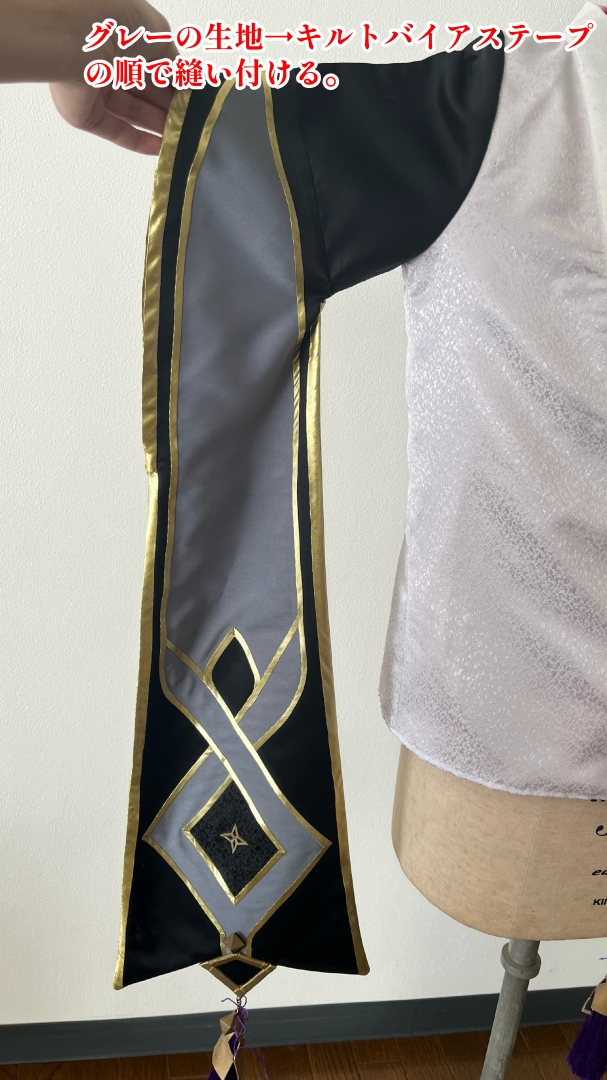 内袖はグレーの模様生地を縫い付けた後に、キルトバイアステープで金色のラインを入れています。