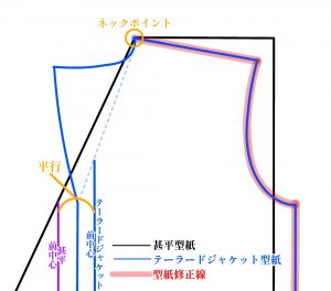 型紙のネックポイントと前中心が平行になるように重ね合わせて、型紙の線を修正します。