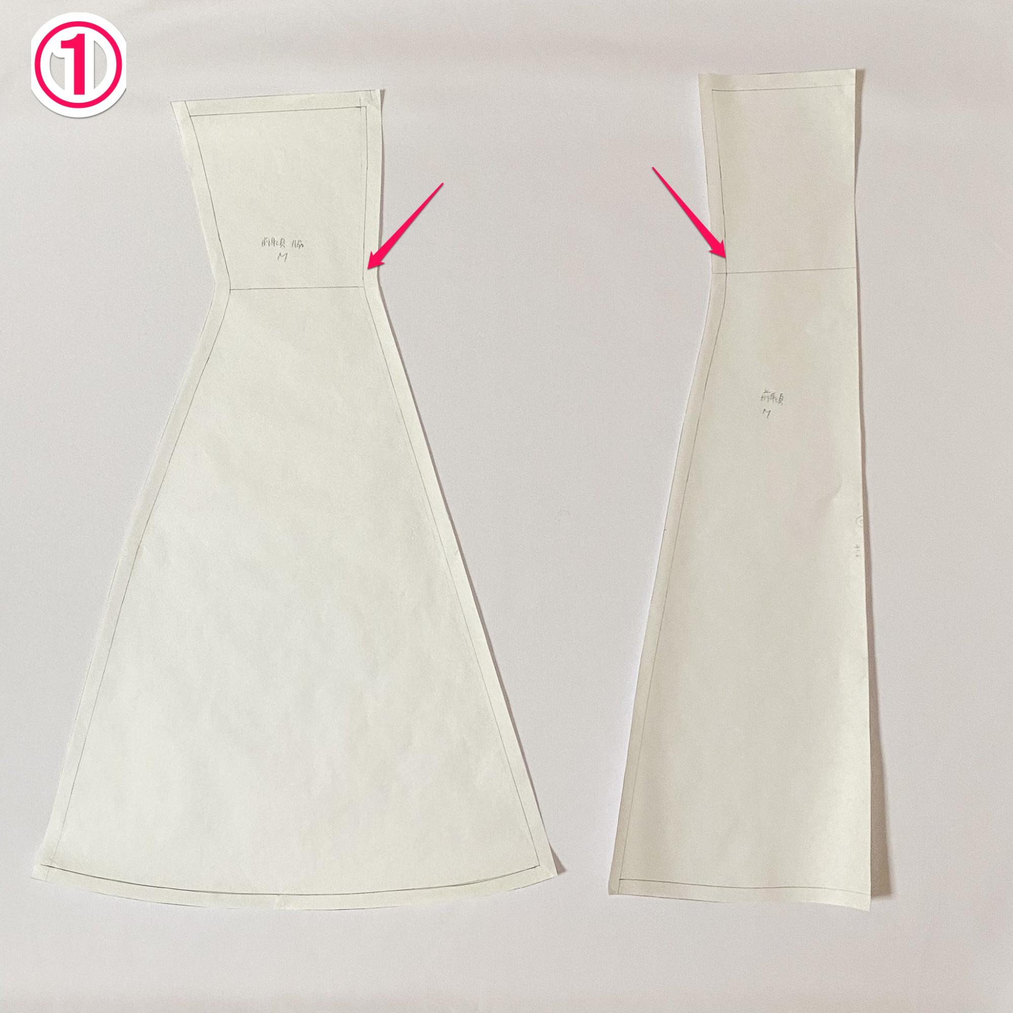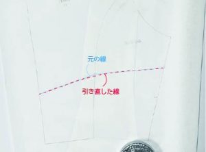 図面上で型紙を改造するのが難しい場合は、一度コピー紙など少しハリのある紙に写し取って、実際に体に当てながら必要な部分を足し引きすると、出来上がりが想像しやすいです☆