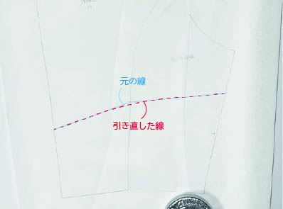 ③肩線と中心線がズレないよう注意しながら、襟ぐりを引き直します。