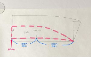 …前は平行、後ろはV字に下がる形で線を引いたら、つながりが自然になるように、それぞれのパーツを突き合わせて調整します。