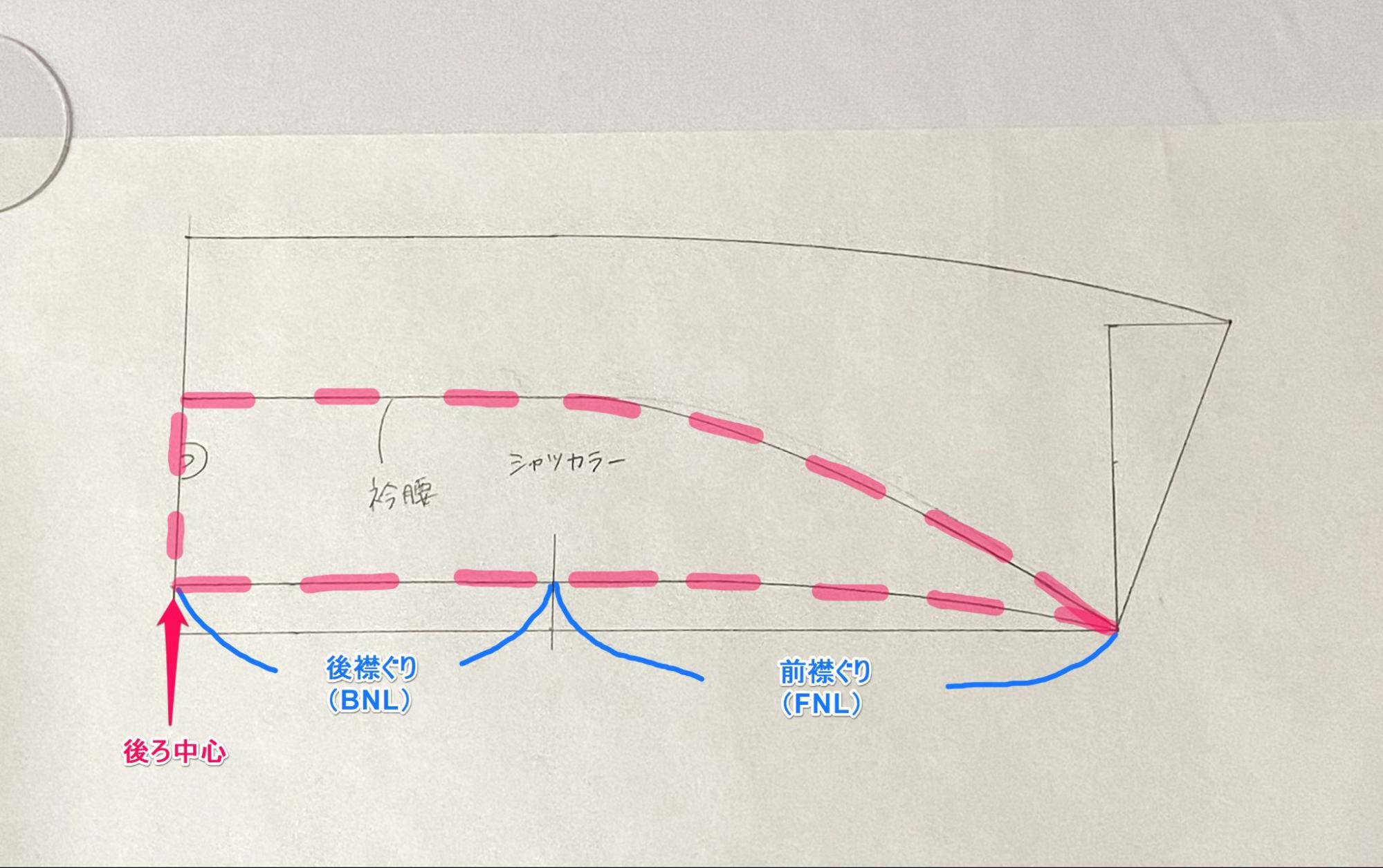 ⑧襟ぐりを測り、シャツ襟を製図します。