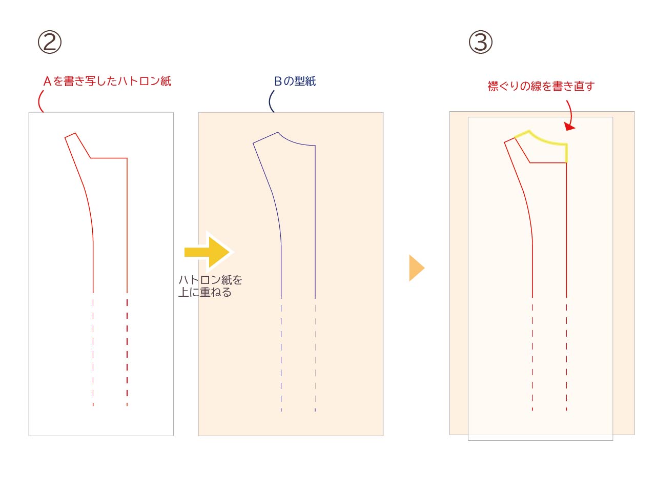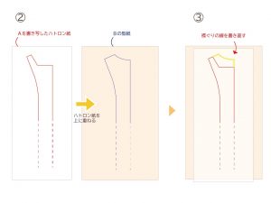 ②襟のデザインをシャツ風にするため、①をB-ノースリーブワンピースの型紙に重ねます。