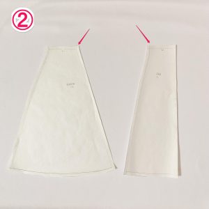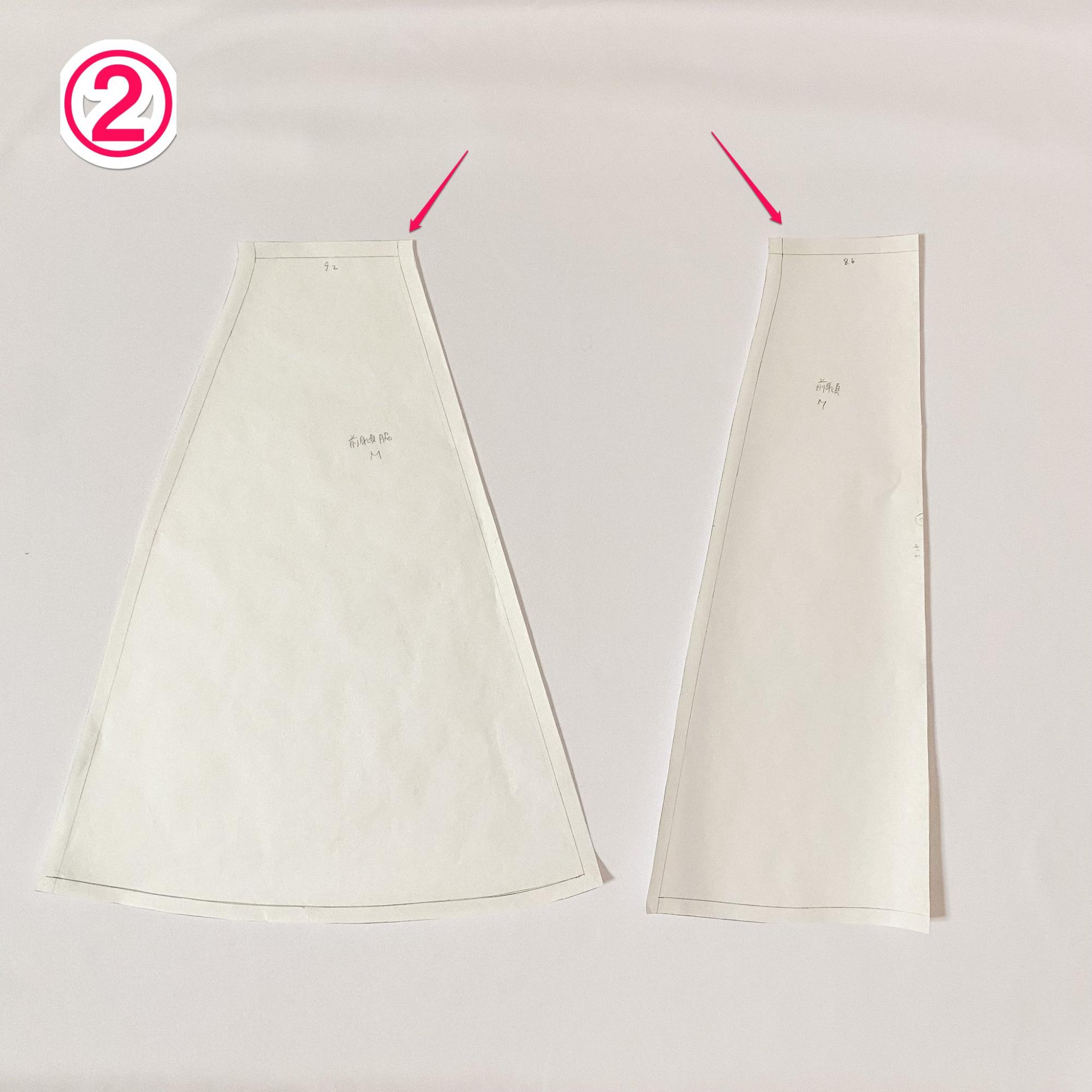 ⑥元の型紙ではスカート丈が背中側に向かって長くなっているため、身長に合わせて、膝上の丈になるように修正します。