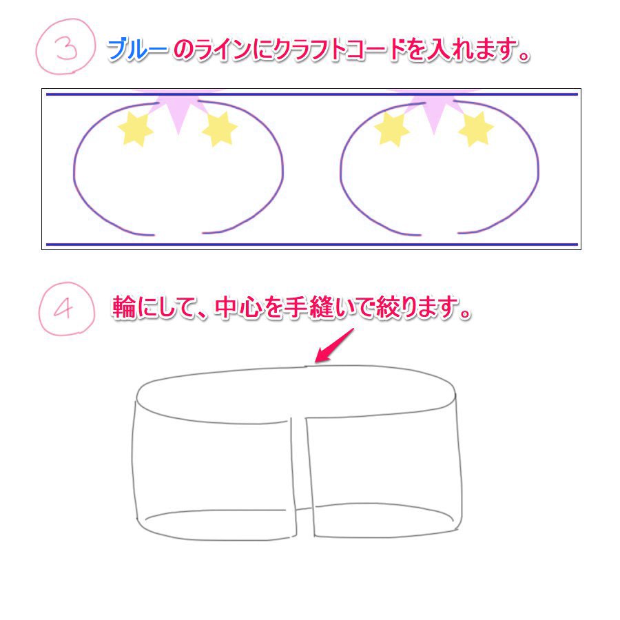 ④リボンを表に返し、クラフトコードを下記の図の位置に入れ、手縫いで固定していきます。