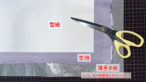 生地を型紙で挟んで裁断をするか、カッターマットの上で裁断をするか、の方法で裁断をしてください。
