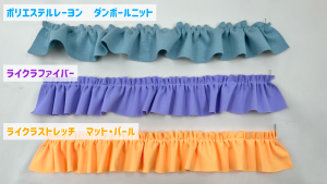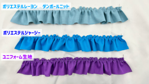 「ポリエステルジャージー」「ユニフォーム生地」「ポリエステルレーヨン ダンボールニット」「ライクラストレッチ マット・パール」「ライクラファイバー」にそれぞれギャザーを寄せてみました。(ギャザー倍率2倍)