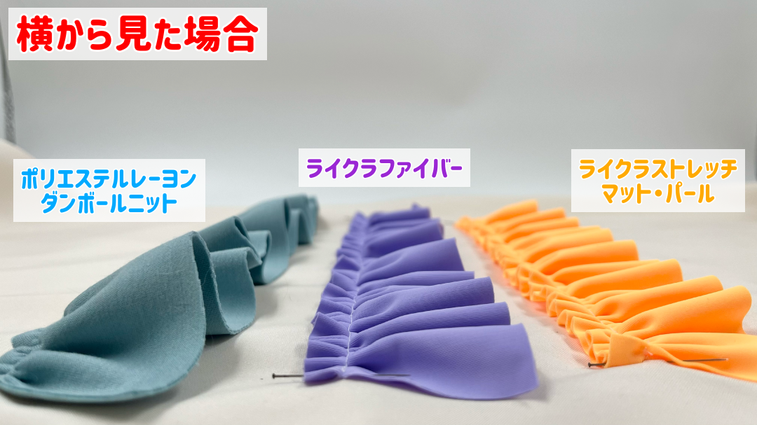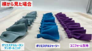 また動画内では、「ポリエステルジャージー」「ユニフォーム生地」「ライクラストレッチ マット・パール」「ライクラファイバー」と生地の質感を比較しております!