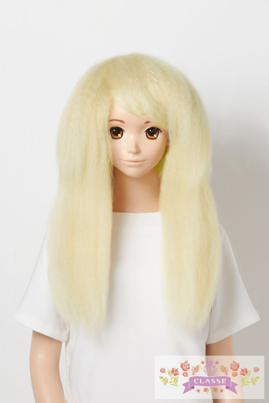 前髪:約35cm(頭頂部~顎下のあたり) 横髪:約60cm(頭頂部~胸下のあたり) 後髪:約60cm(頭頂部~胸下のあたり) ▼つむじの形状 つむじなし ▼重量 約335g ▼コメント ★ふかし加工によるスーパーボリュームで二次元スタイルを再現! ★簡単にアニメスタイルを再現できる! ★ボリュームたっぷりなので透けにくい PROの加工向きウルフスタイルです。 全体ふかし加工仕様。 低温のヘアアイロン(110℃ほど)で一部ボリュームを抑えることも可能。 ■注意事項■ ※熱を加えるとふかしがのび、ボリュームが減ってしまいますので、ご注意ください。 ※熱湯を使用する染色はできません。 <ゴールド01> 2種類の薄いゴールドとオフホワイトをミックス 明るいクリームイエローに仕上げました。 白髪に近い明るい金髪です。 ★色についてのご注意★ PROとSARAは繊維が異なるため、色番号が同じでも繊維の色は同じではありません。 バンス・毛束の同時購入の際はご注意ください。 |