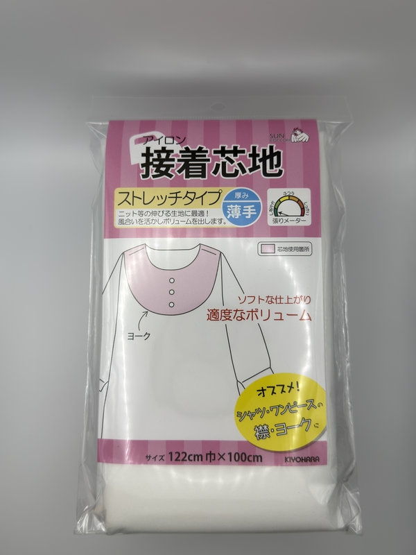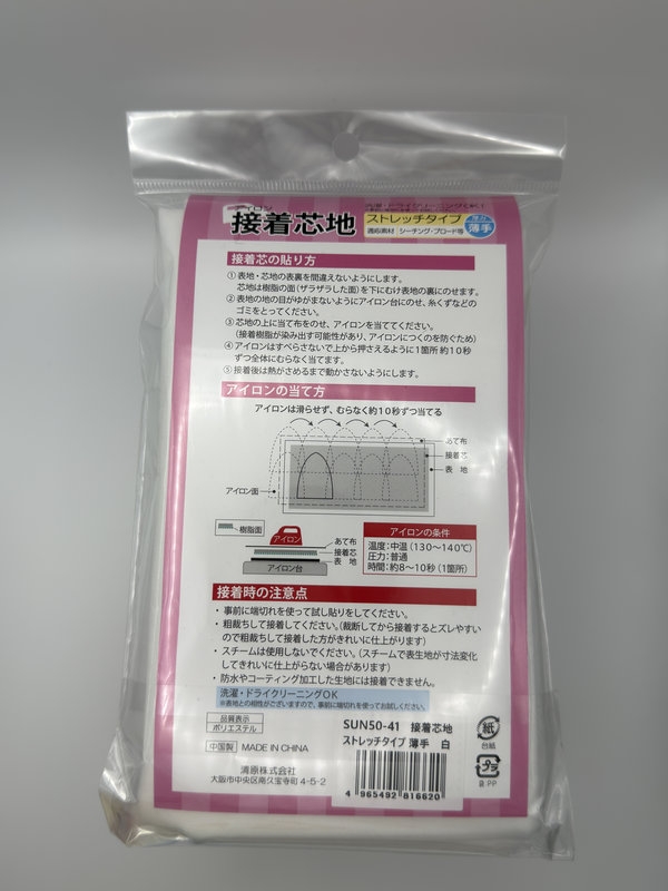 接着芯地 ストレッチ 薄手 白![]() 伸縮性のある生地に最適な、軽くて柔らかいストレッチタイプの接着芯地です。 |