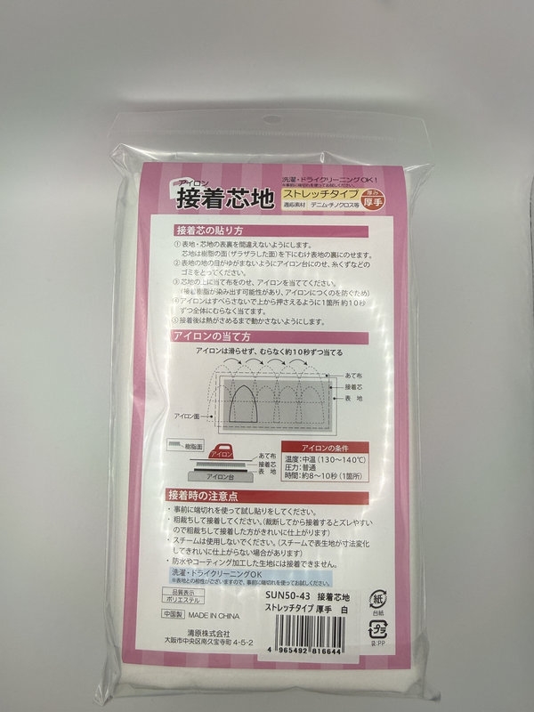 接着芯地 ストレッチ 厚手 白![]() 伸びる生地をしっかり補強できる、ストレッチタイプの厚手接着芯地です。 |