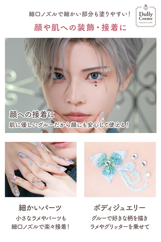 ★細口ノズルで塗りやすい!顔・肌に使える“のり”★★ "ソフトな使い心地でピタっと貼れる!"表現を高める魔法のグルー♪ 匂いを極力抑えたお肌に優しい処方です。 ・ウィッグの髪型キープに ・ヒゲやもみあげ、レース、パーツの肌への接着に ・ボディジュエリー用に ・細口ノズルで細かい部分も届く ■カラー 目立ちにくいクリアタイプ ■内容量 15g ■使用方法 キャップを開け適量をチューブから出し、使用したい肌の箇所に薄く塗布します。 グルーが乾かないうちに接着させたいものを貼り付け、乾燥させます。 使用後は、チューブに付着したグルーを拭き取ってからキャップを閉じます。 ※オフする際は、クレンジングシート等をご使用ください。 ■生産国 日本(化粧品登録済) ■注意事項 ・お肌に異常が生じていないかよく注意してご使用ください。 ・お肌に合わないときはご使用をおやめください。 ・ご使用中、またはご使用後日光にあたって、赤み、はれ、かゆみ、刺激、色抜け(白斑等)や黒ずみ等の異常があらわれた場合は、ご使用を中止し、皮膚科専門医等へご相談ください。 ・傷やはれもの、湿疹等、異常のある部位にはご使用にならないでください。 ・目に入ったときは、すぐに洗い流してください。 ・乳幼児の手の届かないところに保管してください。 ・極端に高温または低温の場所、直射日光のあたる場所には保管しないでください。 ■全成分 水・エタノール・アクリル酸アルキルコポリマーAMP・PVP・1,2-ヘキサンジオール・BG・グリセリン・グリセリルグルコシド・グリコシルトレハロース・加水分解水添デンプン・センブリエキス・ボタンエキス・セイヨウキズタ葉/茎エキス・アラントイン・ヒドロキシエチルセルロース・PEG-40水添ヒマシ油・香料・フェノキシエタノール |