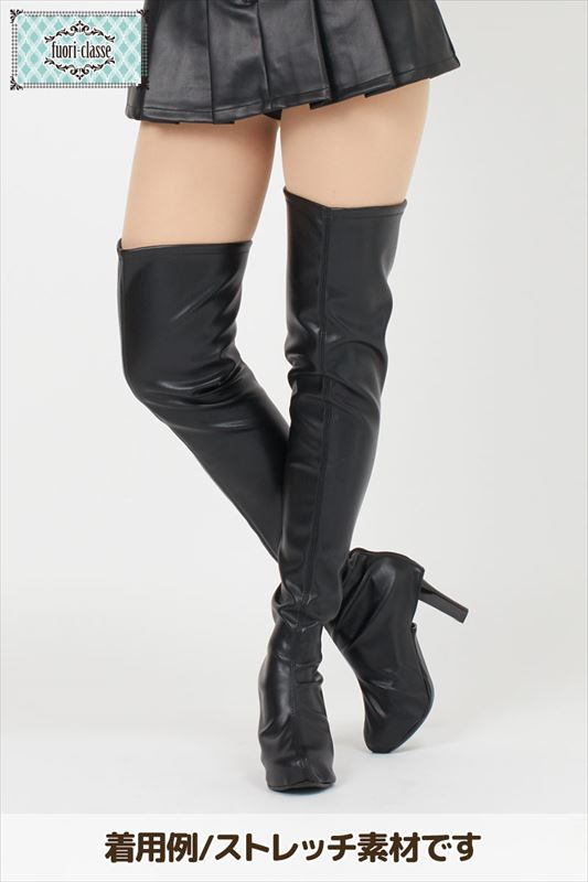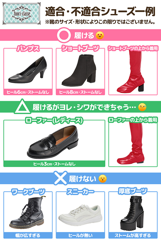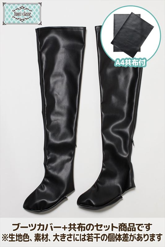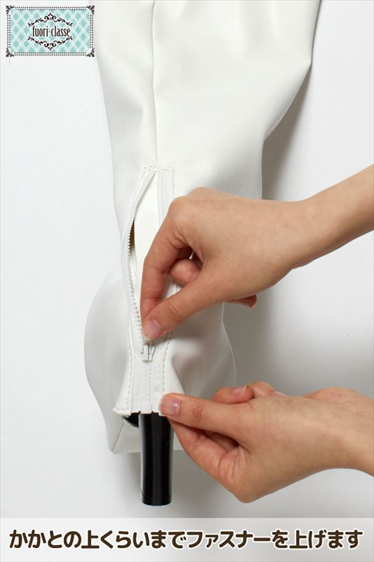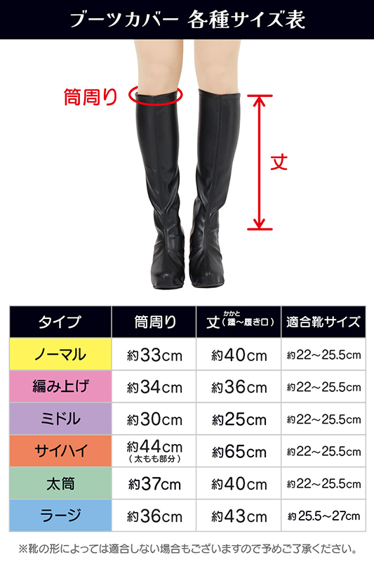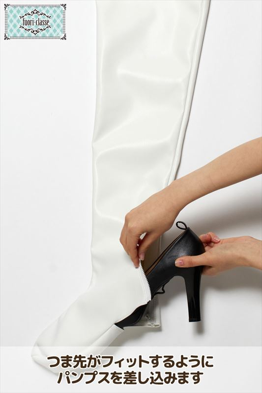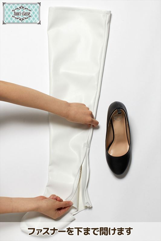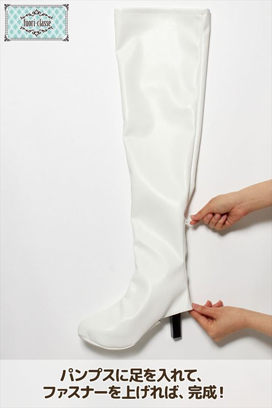 リニューアルして更に進化しました ・ブーツカバーを自由にアレンジできるよう、A4サイズの共布を2枚セット ・より強く、よりスムーズに動くファスナーに変更! ・底布の内側にゴムを使用して、パンプスが出し入れしやすくなりました! ストレッチ合皮製のブーツカバーです。 お手持ちのパンプスに装着してお使いください。 柔らか素材を使用しているので動きやすさ抜群! なかなか手に入らない太ももまで届くサイハイ丈です。 長すぎる場合もカットして調整できます。 ※履き口の処理等はご自身でお願いいたします。 !こんな時に便利! ・理想の長い丈のブーツが見つからない時 ・荷物が多くてブーツが持っていけない時 ・切ったり装飾を縫い付けたり、アレンジしたい時 ■サイズ 丈(かかとから履き口まで):約65cm 筒周り(伸縮性あり):約44cm~49cm 適合パンプスサイズ:22cm~25.5cm ※パンプスの形状により適合サイズでも合わない場合がございます。ご了承ください。 ■材質 ストレッチ合成皮革 ■装着方法 1.ファスナーを下まで開け、つま先がフィットするようにパンプスを差し込みます。 ※サイズの大きいパンプスやつま先の形状が大きい靴は、きっちりとつま先まで入れ込んでください。 つま先がしっかりはまっていないと、かかとのファスナーが上げにくくなります。 2.かかとの上くらいまで、ファスナーを上げます。 3.パンプスに足を入れて、ファスナーを上げれば完成です。 ※サイズの大きい靴の場合はファスナーが非常に上げにくいため、できれば人に上げてもらうなどしてください。 ■取り扱い上のご注意 ・過度な力を加えますと破損いたします。ご注意ください。 ・合皮の色、大きさには若干の個体差があります。あらかじめご了承ください。 ・本商品は写真撮影小物として商品開発しており、歩行用ではありません。 歩行時の破損や怪我・事故等に関して、当社は一切の責任を負いかねますのでご了承ください。 |