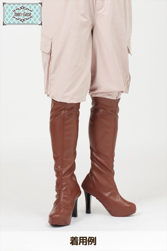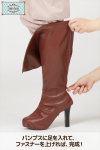 ★手持ちのパンプスがブーツに早変わり!★ リニューアルして更に進化しました ・ブーツカバーを自由にアレンジできるよう、A4サイズの共布を2枚セット ・より強く、よりスムーズに動くファスナーに変更! ・底布の内側にゴムを使用して、パンプスが出し入れしやすくなりました! ストレッチ合皮製のブーツカバーです。 お手持ちのパンプスに装着してお使いください。 柔らか素材を使用しているので動きやすさ抜群! ノーマルサイズより全体に4cm程筒周りを太くしました。 !こんな時に便利! ・荷物が多くてブーツが持っていけない時 ・切ったり装飾を縫い付けたり、アレンジしたい時 ・欲しい色のブーツがなかった時 ■サイズ 丈(かかとから履き口まで):約40cm 筒周り(伸縮性あり):約37cm~42cm 適合パンプスサイズ:22cm~25.5cm ※パンプスの形状により適合サイズでも合わない場合がございます。ご了承ください。 ■材質 ストレッチ合成皮革 ■装着方法 1.ファスナーを下まで開け、つま先がフィットするようにパンプスを差し込みます。 ※サイズの大きいパンプスやつま先の形状が大きい靴は、きっちりとつま先まで入れ込んでください。 つま先がしっかりはまっていないと、かかとのファスナーが上げにくくなります。 2.かかとの上くらいまで、ファスナーを上げます。 3.パンプスに足を入れて、ファスナーを上げれば完成です。 ※サイズの大きい靴の場合はファスナーが非常に上げにくいため、できれば人に上げてもらうなどしてください。 ■取り扱い上のご注意 ・過度な力を加えますと破損いたします。ご注意ください。 ・合皮の色、大きさには若干の個体差があります。あらかじめご了承ください。 ・本商品は写真撮影小物として商品開発しており、歩行用ではありません。 歩行時の破損や怪我・事故等に関して、当社は一切の責任を負いかねますのでご了承ください。 |