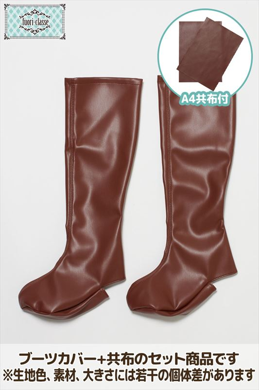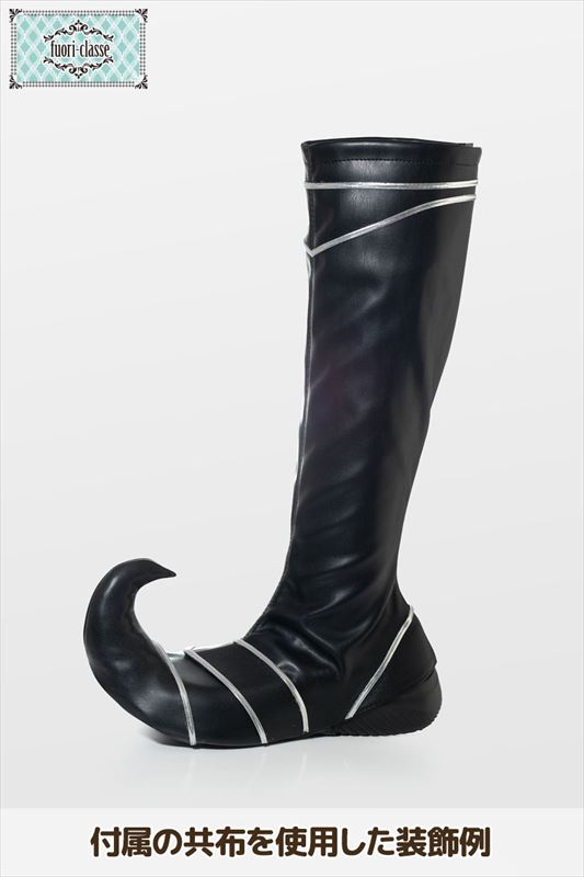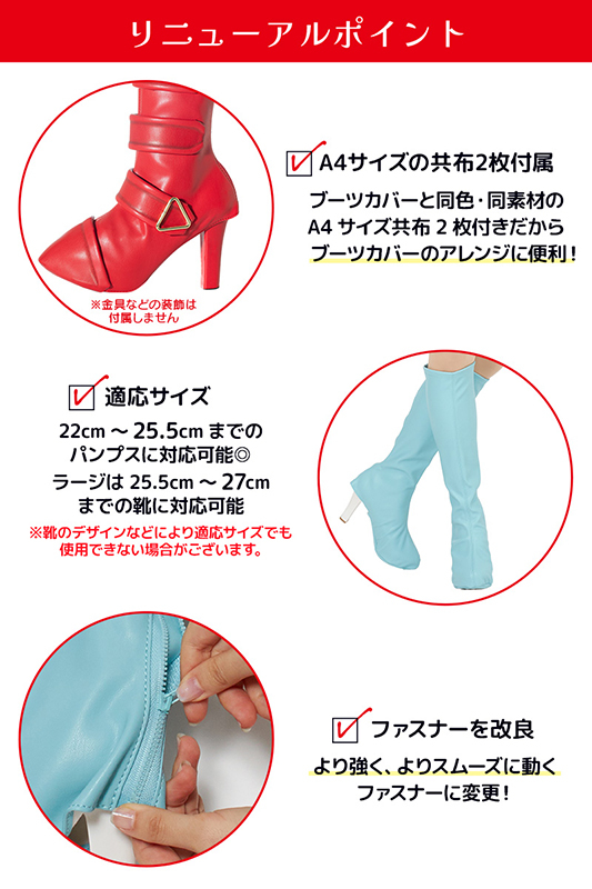 リニューアルして更に進化しました ・ブーツカバーを自由にアレンジできるよう、A4サイズの共布を2枚セット ・より強く、よりスムーズに動くファスナーに変更! ・底布の内側にゴムを使用して、靴が出し入れしやすくなりました! ストレッチ合皮製のブーツカバーです。 お手持ちの靴に装着してお使いください。 柔らか素材を使用しているので動きやすさ抜群! 大きいサイズの靴にもご使用いただけるよう足部分のサイズを大きくしました。 男性でもお使いいただけます! また、ヒールの低い靴でもご使用いただけるよう、パターンを変更しました。 ※スニーカーやウェッジソールなど、ヒールと本体が繋がった形状の靴にはお使いいただけませんのでご注意ください。 !こんな時に便利! ・荷物が多くてブーツが持っていけない時 ・切ったり装飾を縫い付けたり、アレンジしたい時 ・欲しい色のブーツがなかった時 ■サイズ 丈(かかとから履き口まで):約43cm 筒周り(伸縮性あり):約36cm~41cm 適合靴サイズ:25.5cm~27cm ※靴の形状により適合サイズでも合わない場合がございます。ご了承ください。 ■材質 ストレッチ合成皮革 ■装着方法 1.ファスナーを下まで開け、つま先がフィットするように靴を差し込みます。 ※サイズの大きい靴やつま先の形状が大きい靴は、きっちりとつま先まで入れ込んでください。 つま先がしっかりはまっていないと、かかとのファスナーが上げにくくなります。 2.かかとの上くらいまで、ファスナーを上げます。 3.靴に足を入れて、ファスナーを上げれば完成です。 ※サイズの大きい靴の場合はファスナーが非常に上げにくいため、できれば人に上げてもらうなどしてください。 ■取り扱い上のご注意 ・過度な力を加えますと破損いたします。ご注意ください。 ・合皮の色、大きさには若干の個体差があります。あらかじめご了承ください。 ・本商品は写真撮影小物として商品開発しており、歩行用ではありません。 歩行時の破損や怪我・事故等に関して、当社は一切の責任を負いかねますのでご了承ください。 |