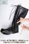 ★手持ちのパンプスがブーツに早変わり!★ リニューアルして更に進化しました ・ブーツカバーを自由にアレンジできるよう、A4サイズの共布を2枚セット ・より強く、よりスムーズに動くファスナーに変更! ・底布の内側にゴムを使用して、パンプスが出し入れしやすくなりました! ストレッチ合皮製の編み上げタイプのブーツカバーです。 お手持ちのパンプスに装着してお使いください。 ストレッチ素材を使用しているので動きやすさ抜群! !こんな時に便利! ・荷物が多くてブーツが持っていけない時 ・切ったり装飾を縫い付けたり、アレンジしたい時 ・欲しい色のブーツがなかった時 ■サイズ 丈(かかとから履き口まで):約36cm そのままの状態筒周り:約34cm~39cm ※編み上げ紐を緩めることで、もっと広げることができます。 適合パンプスサイズ:22cm~25.5cm ※パンプスの形状により適合サイズでも合わない場合がございます。ご了承ください。 ■材質 ストレッチ合成皮革 ■装着方法 1.ファスナーを下まで開け、つま先がフィットするようにパンプスを差し込みます。 ※サイズの大きいパンプスやつま先の形状が大きい靴は、きっちりとつま先まで入れ込んでください。 つま先がしっかりはまっていないと、かかとのファスナーが上げにくくなります。 2.かかとの上くらいまで、ファスナーを上げます。 3.パンプスに足を入れて、ファスナーを上げれば完成です。 ※サイズの大きい靴の場合はファスナーが非常に上げにくいため、できれば人に上げてもらうなどしてください。 ■取り扱い上のご注意 ・過度な力を加えますと破損いたします。ご注意ください。 ・合皮の色、大きさには若干の個体差があります。あらかじめご了承ください。 ・本商品は写真撮影小物として商品開発しており、歩行用ではありません。 歩行時の破損や怪我・事故等に関して、当社は一切の責任を負いかねますのでご了承ください。 |
