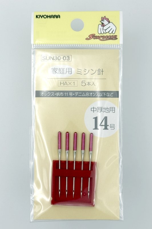 サンコッコーの家庭用ミシン針は、針の号数が分かりやすいように、色付けをしています【14号:赤色】