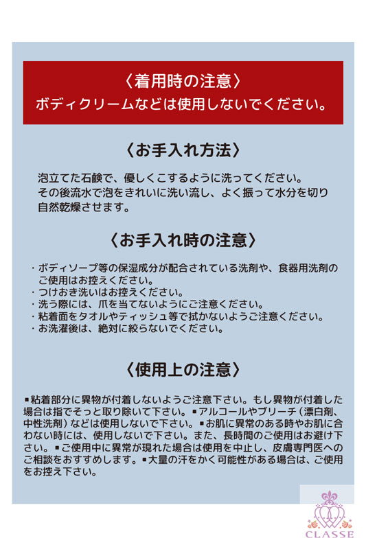 華奢な肩・巻き肩・なで肩 、そんなお悩みを解決するシリコン製の極厚肩パッドです。 ・縦向きに貼って、肩に高さをプラス ポイントを高い位置に持ってくるので腕が細く見える◎ ・横向きに貼って、肩幅をプラス 肩幅が出てバランスの良いシルエットに◎ ※着用の際、ボディクリームなどは使用しないでください。 <お手入れ方法> 泡立てた石鹸で、優しくこするように洗ってください。その後流水で泡をきれいに洗い流し、よく振って水分を切り自然乾燥させます。 ※お手入れ時の注意 ・ボディソープ等の保湿成分が配合されている洗剤や、食器用洗剤のご使用はお控えください。 ・つけおき洗いはお控えください。 ・洗う際には、爪を当てないようにご注意ください。 ・粘着面をタオルやティッシュで拭かないようご注意ください。 ・お洗濯後は、絶対に絞らないでください。 <使用上のご注意> ★粘着部分に異物が付着しないようご注意ください。もし異物が付着した場合は指でそっと取り除いてください。 ★アルコールやブリーチ(漂白剤、中性洗剤)などは使用しないでください。 ★お肌に異常のある時やお肌に合わない時には、使用しないでください。また、長時間のご使用はお避け下さい。 ★ご使用中に異常が現れた場合は使用を中止し、皮膚専門医へのご相談をおすすめします。 ★大量の汗をかく可能性がある場合は、ご使用をお控えください。 |