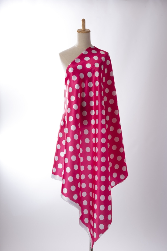 定番の水玉模様のサテン生地となります。水玉模様の程よい大きさが衣装に最適です。