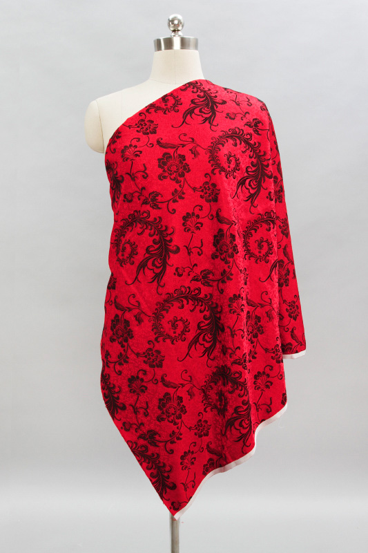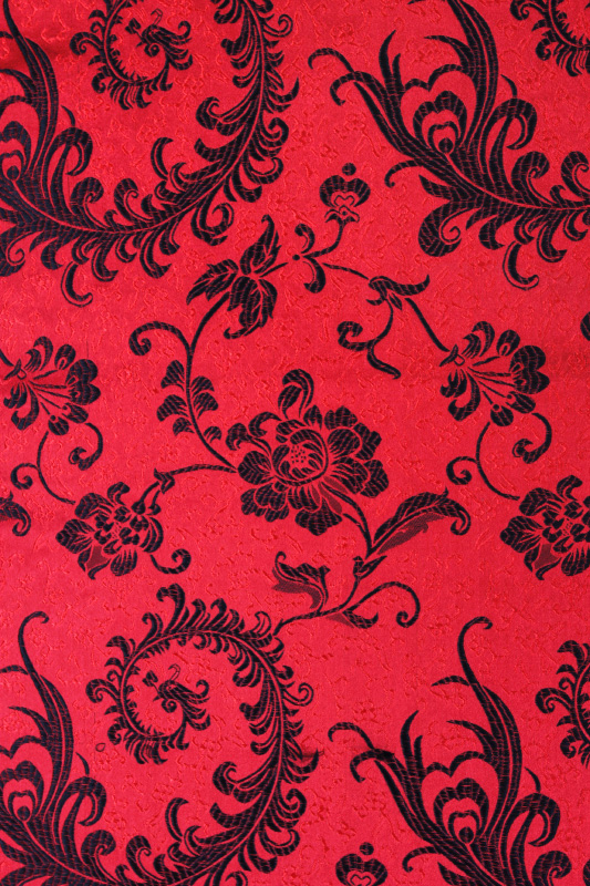 中国風デザインや和装にも応用できるチャイナ生地です。刺繍風に織り込まれた大ぶりな羽根と牡丹柄と下地の細かい総柄が華やかな印象です。チャイナ衣装、和装、ステージ衣装に最適です。下地の控えめで上品な光沢の色合いに光沢の強い糸で柄を仕上げているため立体感があります。高級感のある仕上がりになります。